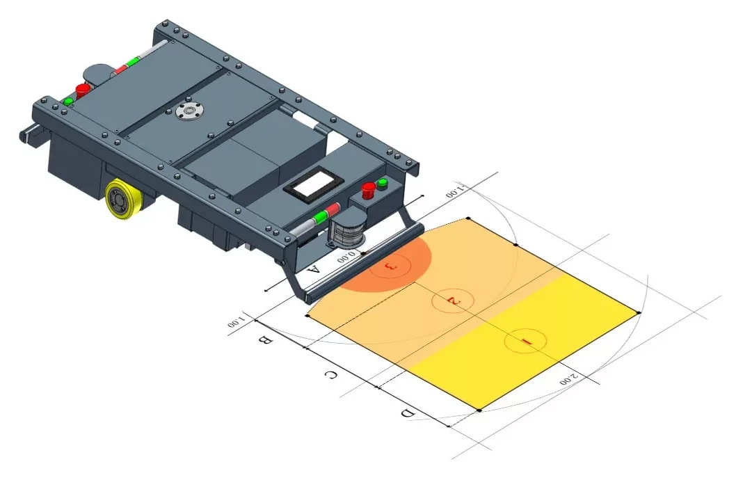 When the AGV is in operation and detects an obstacle within the sensor’s scanning zone, the system will automatically respond according to predefined safety zones. Based on the distance between the obstacle and the AGV, appropriate actions are taken to ensure safety:
